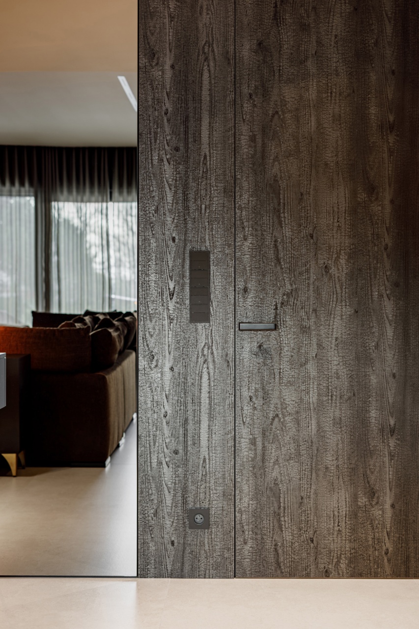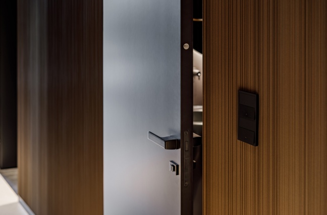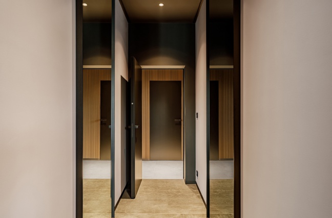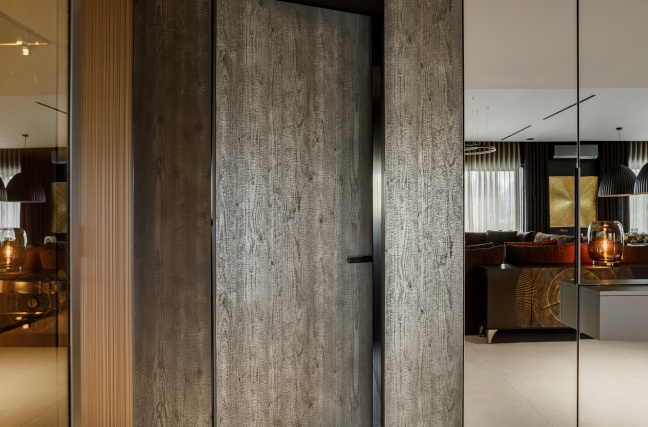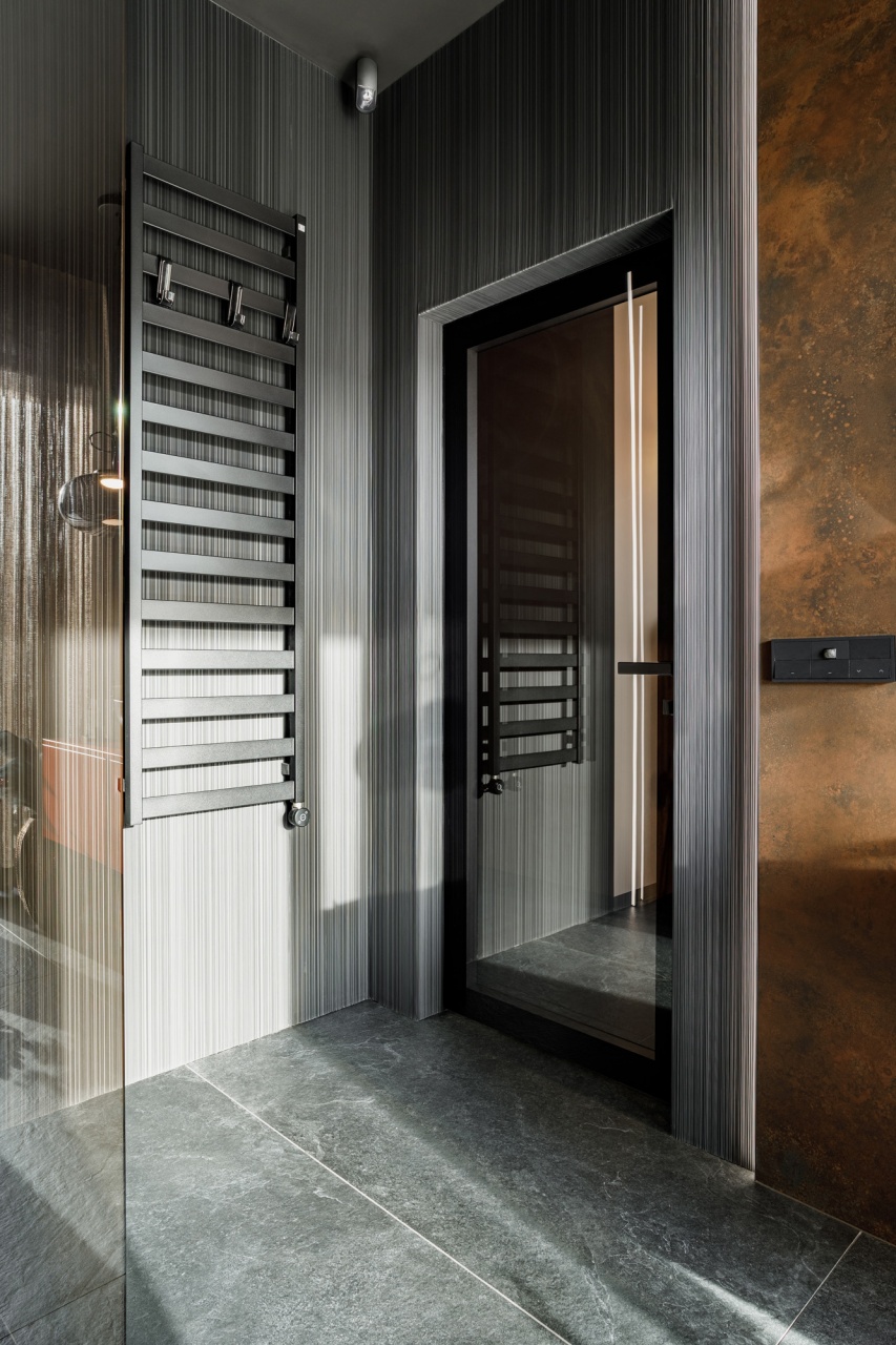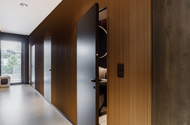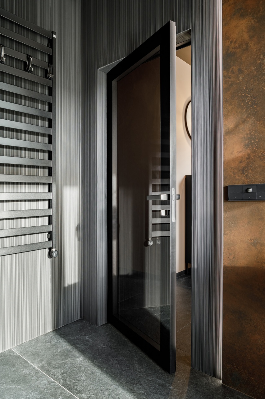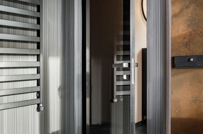 W łazience z kolei wykorzystani przeszklone drzwi licowane ze ścianą, osadzone w subtelnej aluminiowej ramie. Transparentna forma drzwi dodaje im lekkości, jednocześnie nie zaburzając spójności stylistycznej wnętrza. Połączenie ciemnych ścian, grafitowej posadzki oraz precyzyjnie dobranych elementów wyposażenia tworzy elegancką, nowoczesną przestrzeń.
