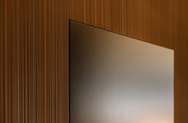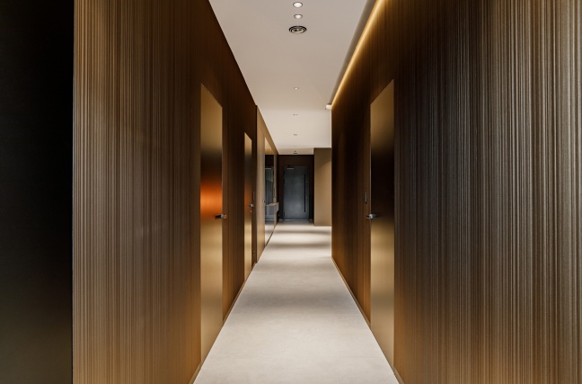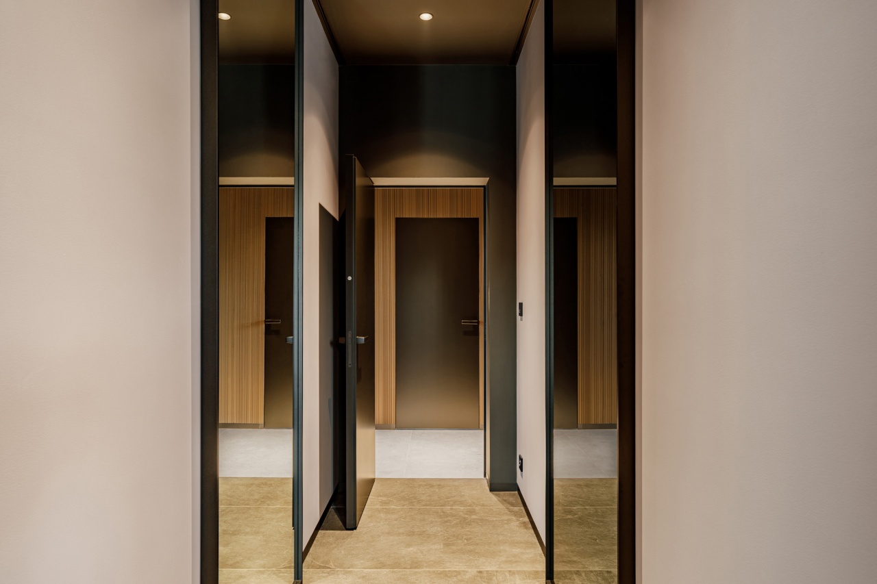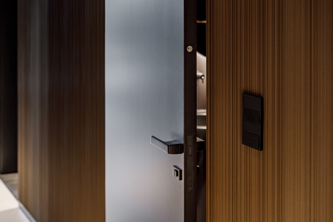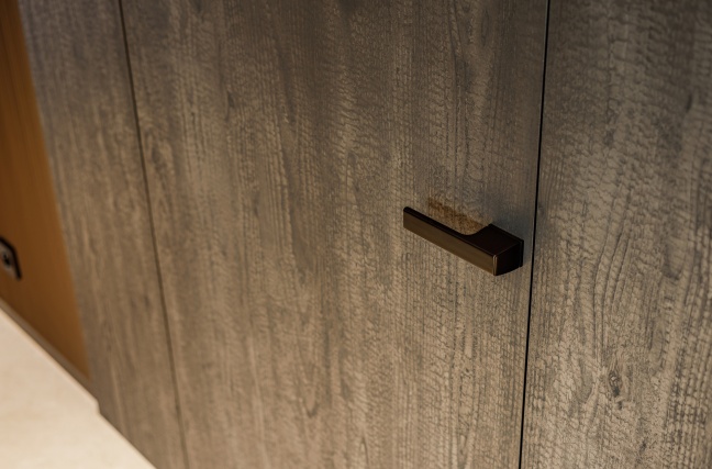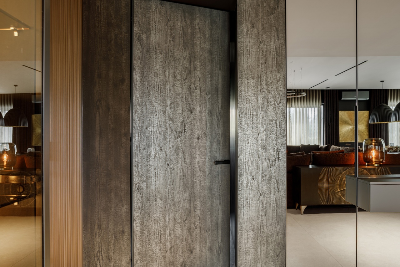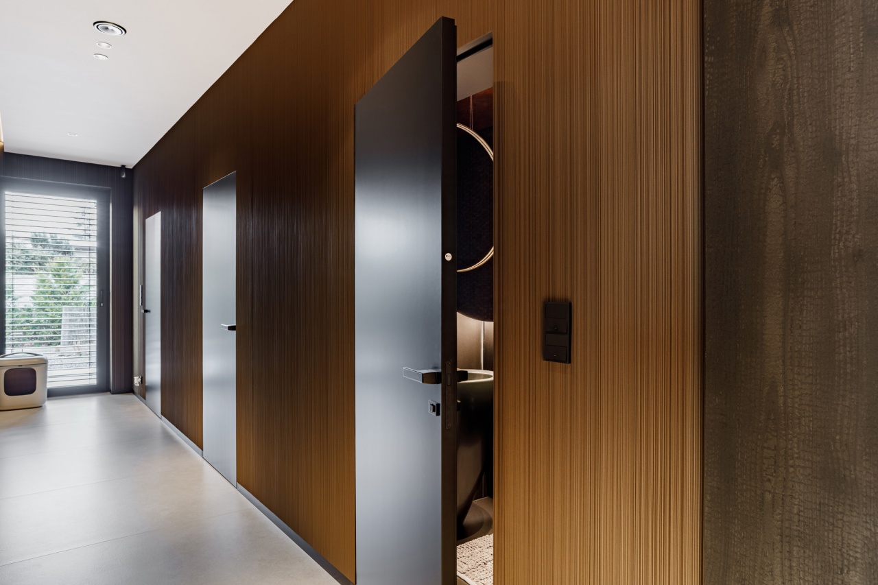 W łazience z kolei wykorzystani przeszklone drzwi licowane ze ścianą, osadzone w subtelnej aluminiowej ramie. Transparentna forma drzwi dodaje im lekkości, jednocześnie nie zaburzając spójności stylistycznej wnętrza. Połączenie ciemnych ścian, grafitowej posadzki oraz precyzyjnie dobranych elementów wyposażenia tworzy elegancką, nowoczesną przestrzeń.