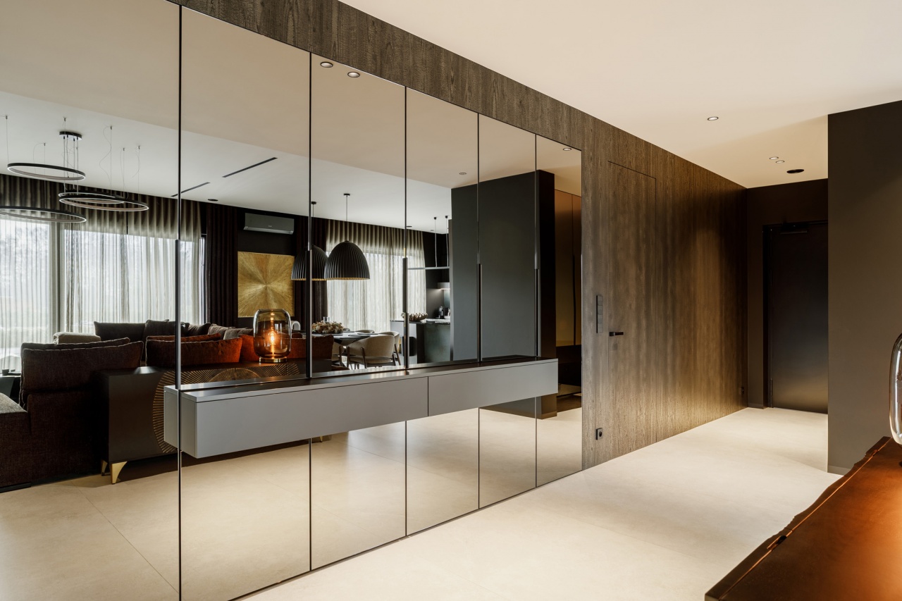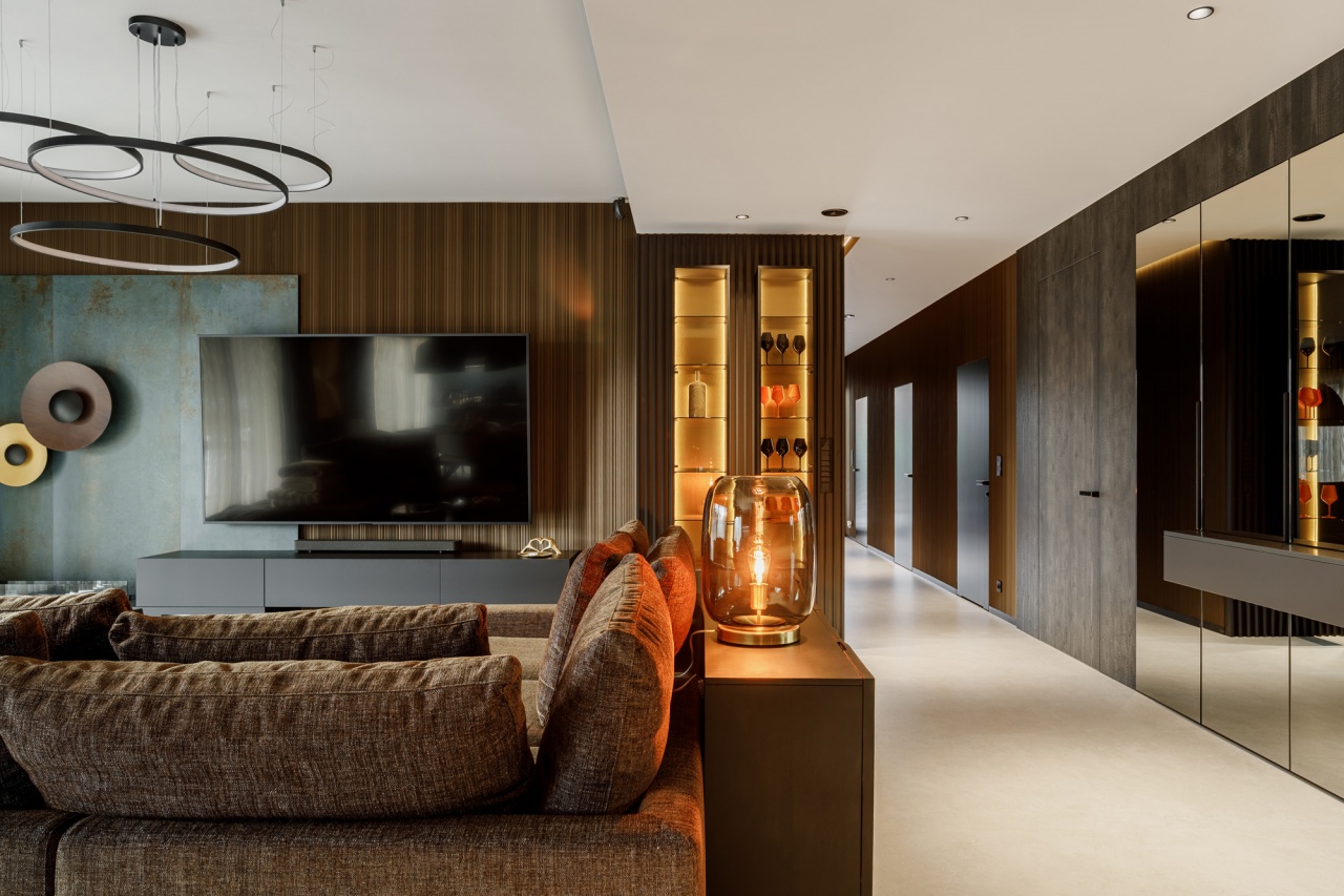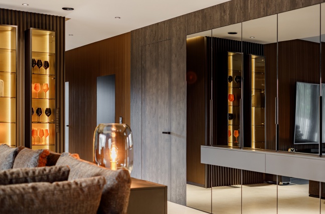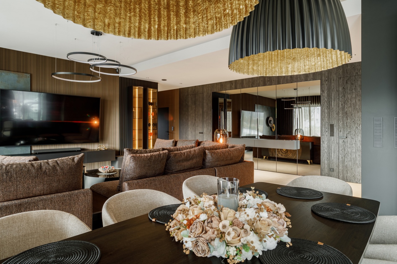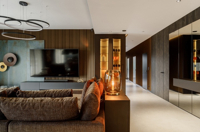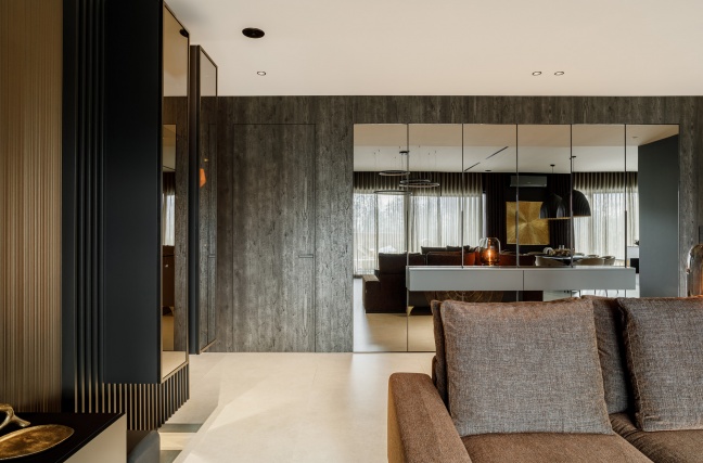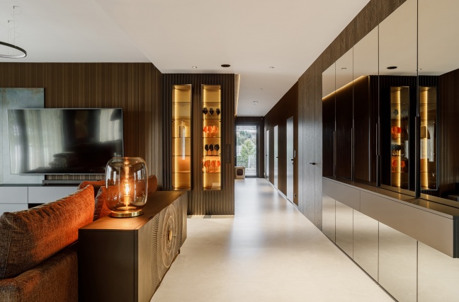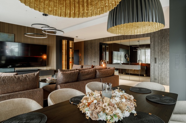 Strefa dzienna łączy w sobie nowoczesną formę z wyraźnym zamiłowaniem do szlachetnych materiałów. Miękkie tapicerowane sofy, ciemne drewno oraz starannie zaprojektowane oświetlenie budują klimat sprzyjający relaksowi. Dekoracyjne lampy ocieplają przestrzeń i podkreślają jej elegancki charakter, a lustrzane powierzchnie subtelnie powiększają wnętrze i odbijają światło.