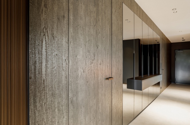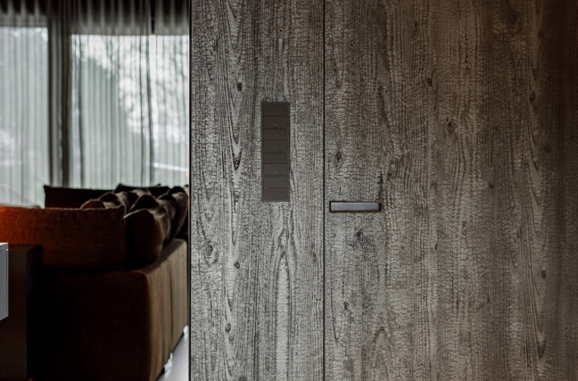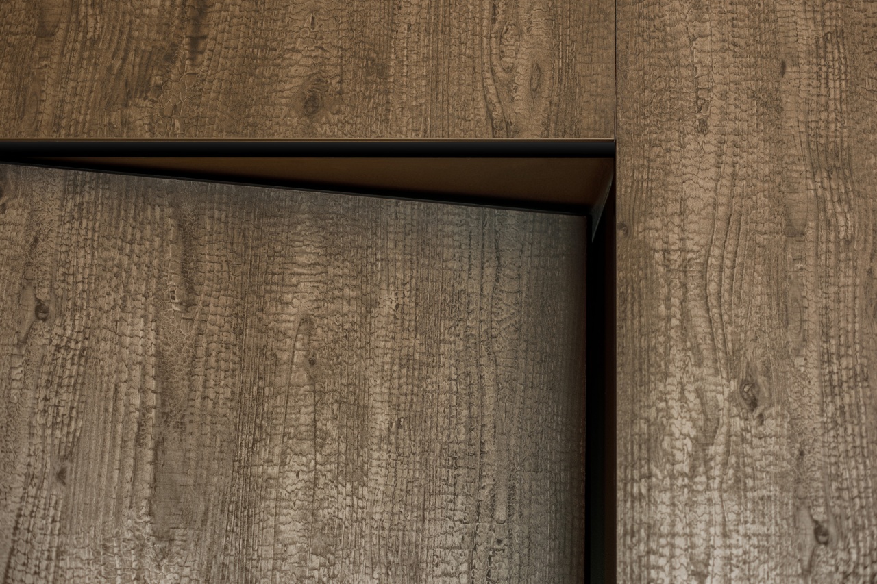 Hol oraz komunikacja zostały zaprojektowane w sposób spójny z resztą domu. Ściany wykończone laminatem imitującym palone drewno nadają przestrzeni wyrazistości i głębi. Drzwi zostały w pełni zlicowane ze ścianą i wykonane z tego samego materiału, dzięki czemu tworzą jednolitą, minimalistyczną płaszczyznę. To rozwiązanie podkreśla nowoczesny charakter wnętrza i dbałość o detal.