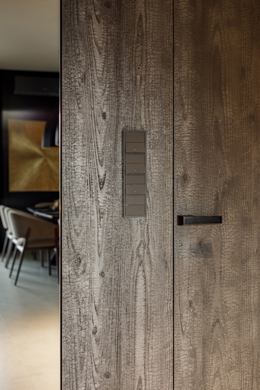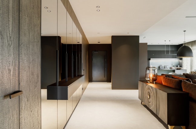 Ten projekt to dowód na to, że ciemna kolorystyka może tworzyć wnętrze niezwykle przytulne i eleganckie zarazem. Całość została utrzymana w głębokich, nasyconych barwach, jednak dzięki zastosowaniu ciepłych odcieni brązu, grafitu i złamanych czerni przestrzeń nie przytłacza, a wręcz zaprasza do środka spokojną, nastrojową atmosferą.