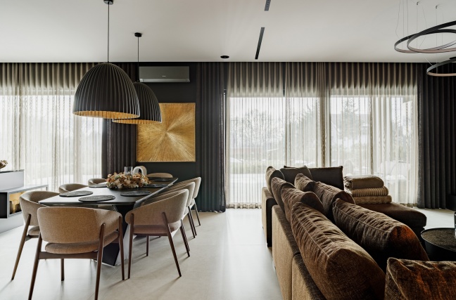 Cały dom jest przykładem konsekwentnie zaprojektowanego wnętrza, w którym forma, kolor i materiał wzajemnie się uzupełniają. To realizacja dla osób, które cenią odważniejsze rozwiązania, elegancję oraz atmosferę przytulności zamkniętą w ciemniejszej, ale niezwykle szlachetnej palecie barw.