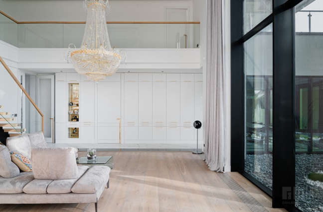 Z jednej strony ogromne przeszklenia, nowoczesne schody, szklane balustrady, a z drugiej marmury i kryształowe żyrandole. Taki zestaw to prawdziwa mieszanka stylów, która może wydawać się zbyt skrajna, jednak odpowiedni dobór materiałów, kolorów i form oraz zachowanie właściwej równowagi pomiędzy nimi sprawiły, że całość robi oszałamiający efekt.