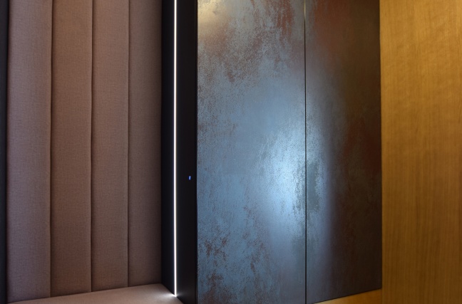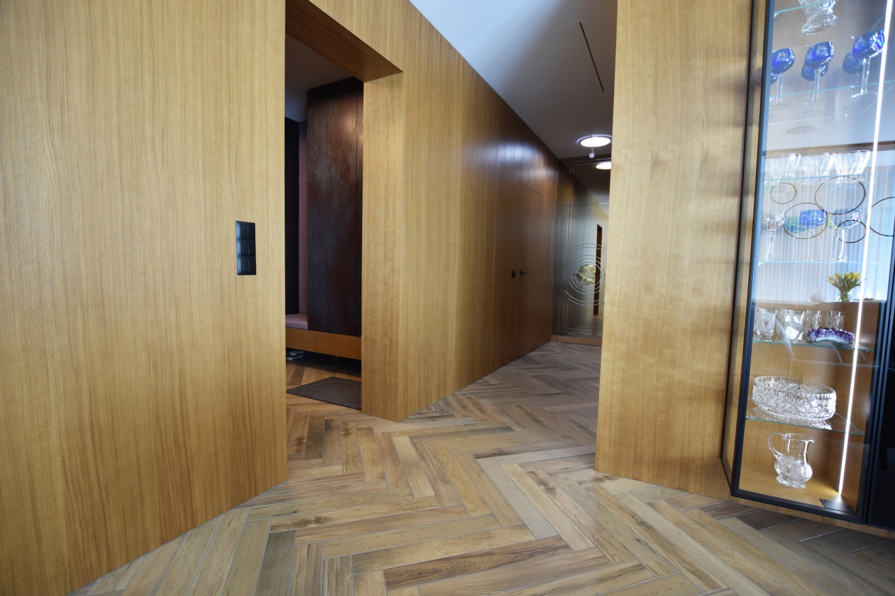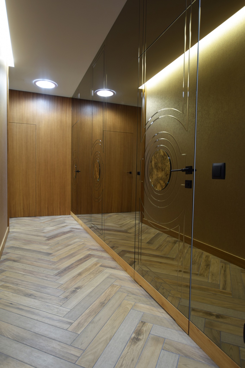 Miodowy kolor znajdziemy również na ścianach, gdzie zamontowaliśmy fornirowane panele oraz zlewające się z nimi drzwi bezprzylgowe. Tworzą one efektowną, jednolitą płaszczyznę, która płynnie łączy wejście do domu z korytarzem, salonem i kuchnią. Elegancki styl wnętrz podkreślają drzwi poszyte złotym antycznym lustrem.