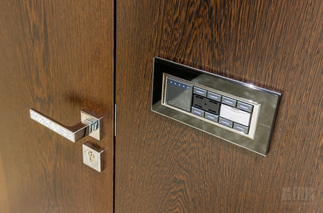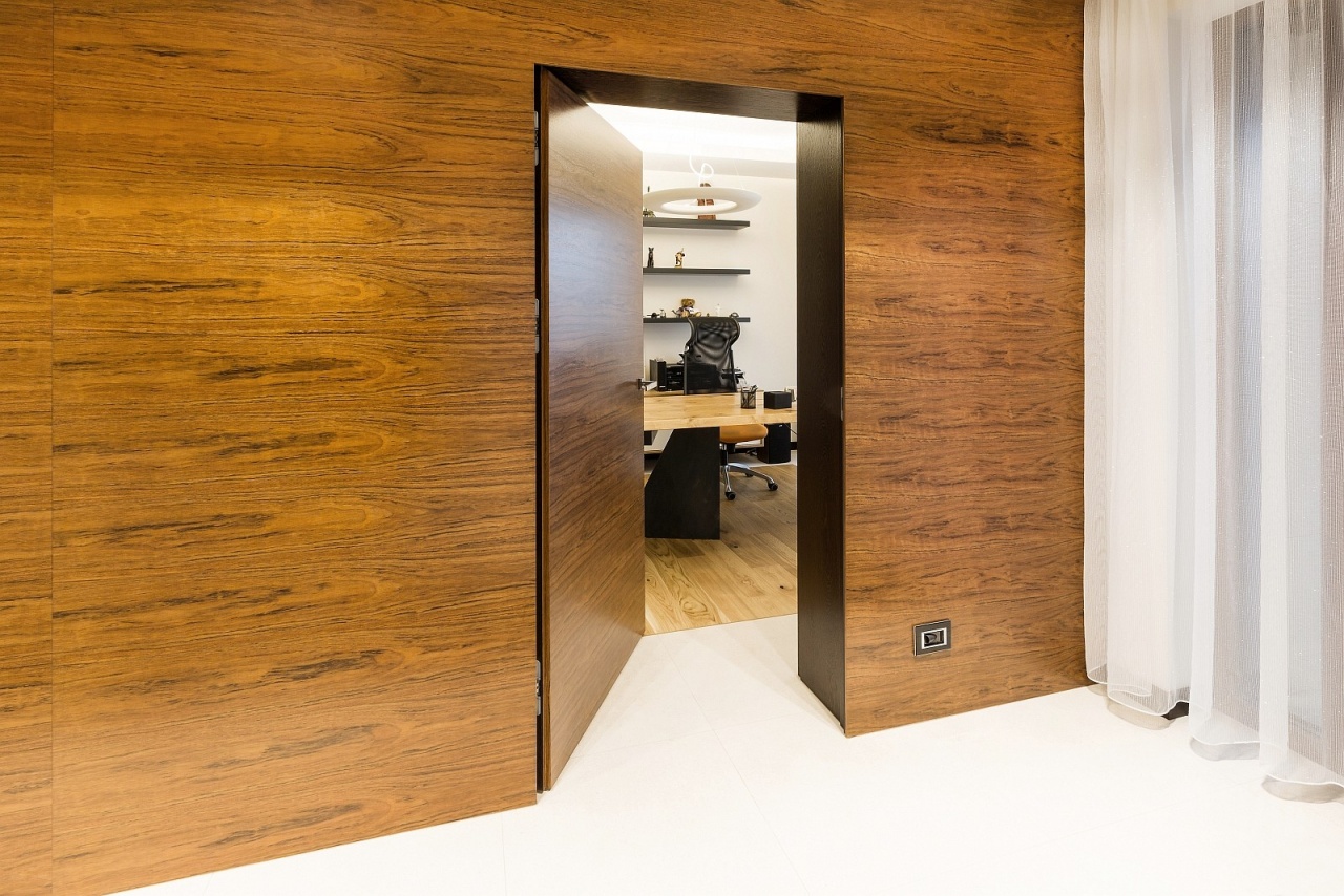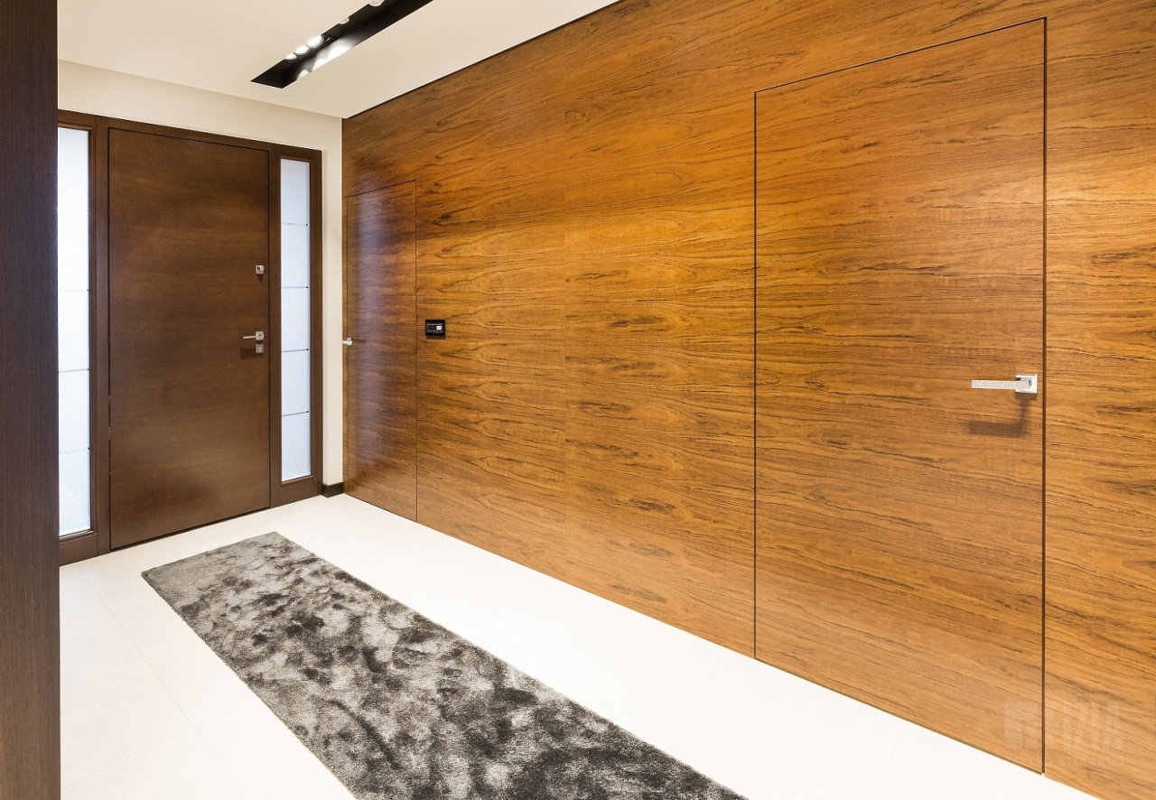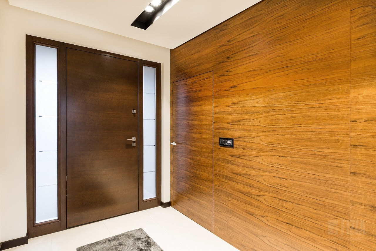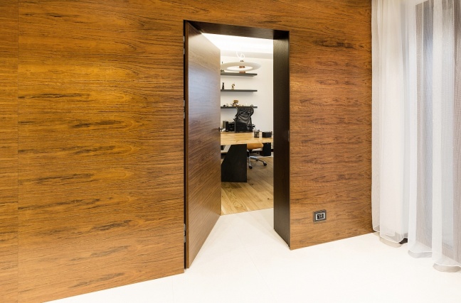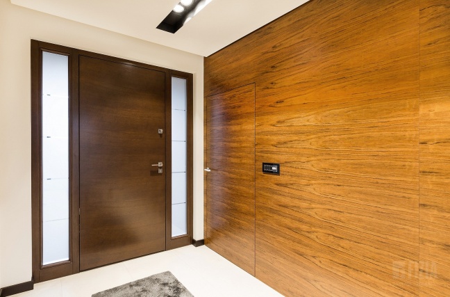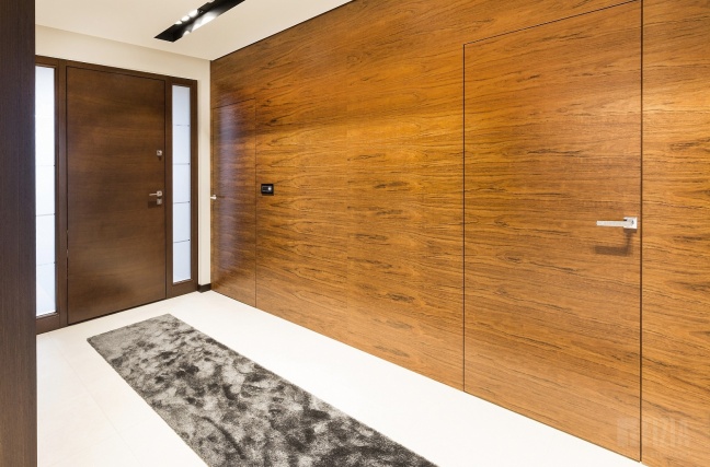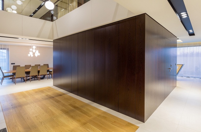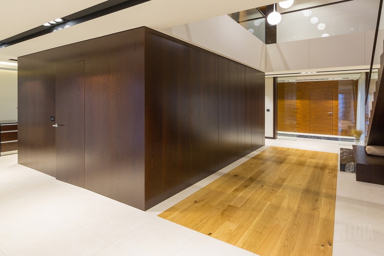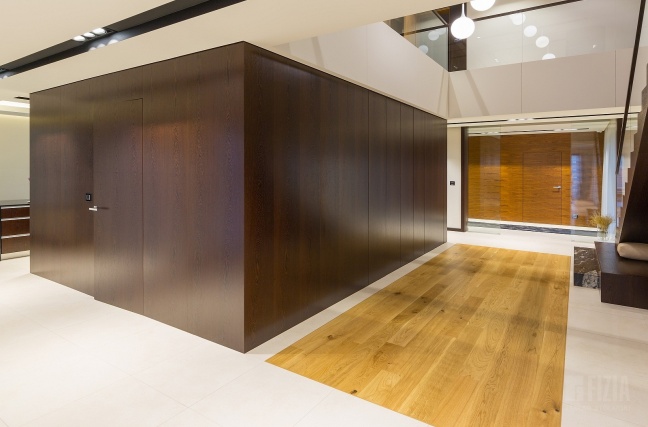 Drugie, nieco jaśniejsze i cieplejsze drewno wykorzystano w wybranych partiach wnętrza – również w zabudowie ściennej z ukrytymi drzwiami. Delikatny kontrast między odcieniami dodaje kompozycji głębi i „smaczku”, a jednocześnie przełamuje surowość geometrii. To połączenie dwóch tonacji drewna sprawia, że wnętrze zyskuje nie tylko nowoczesny charakter, ale także przytulność i ponadczasowy styl.