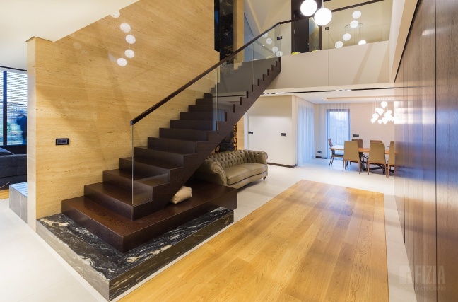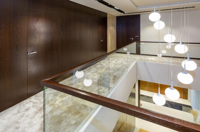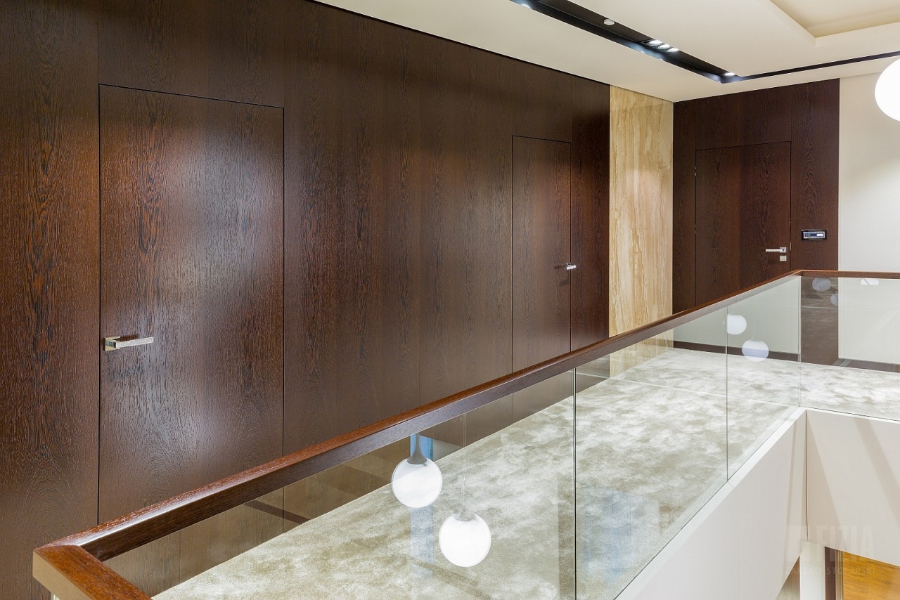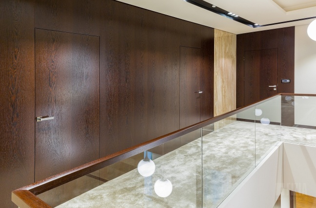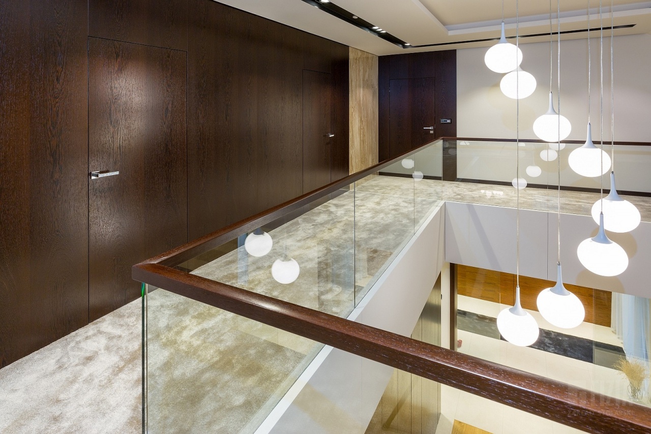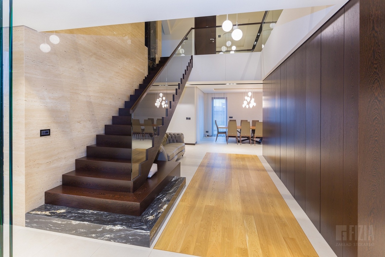 Centralnym punktem domu jest przestronna antresola, która dzięki szklanej balustradzie wydaje się lekka i otwarta. Jej wykończenie z ciemnego drewna idealnie współgra ze schodami dywanowymi o tej samej tonacji. To właśnie to drewno nadaje wnętrzu charakteru – eleganckiego, ale nieprzytłaczającego, wprowadzając nutę naturalnego ciepła do minimalistycznej architektury.