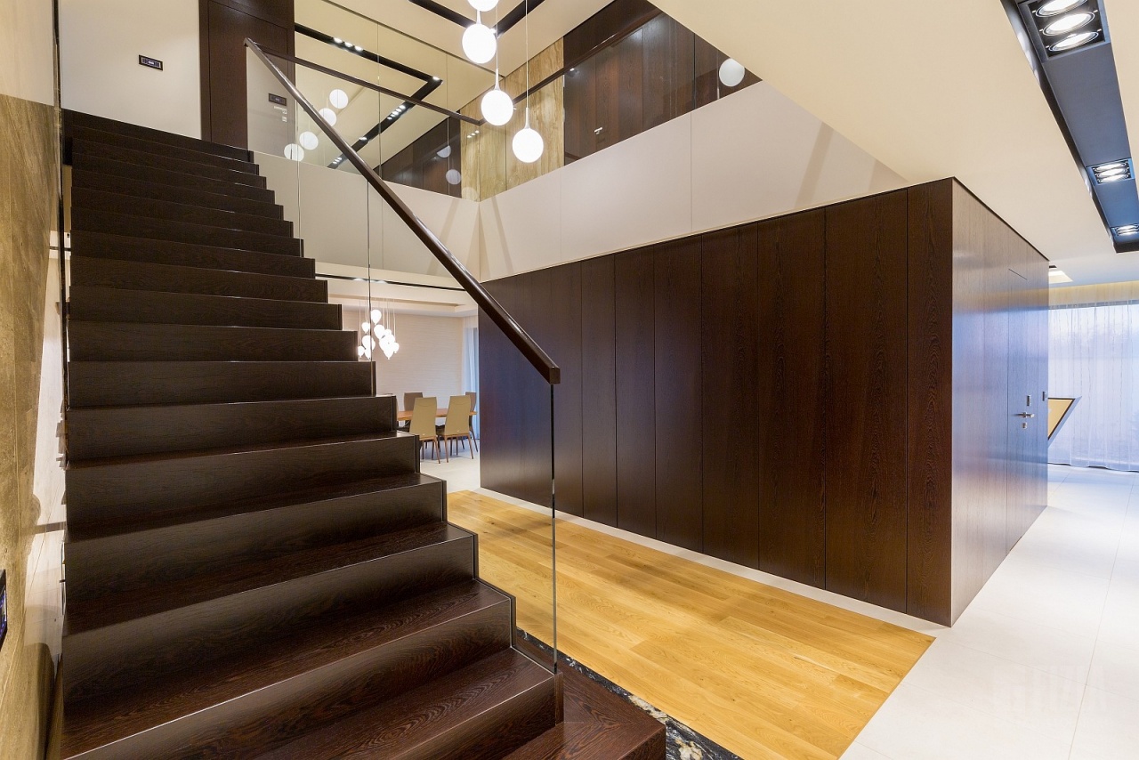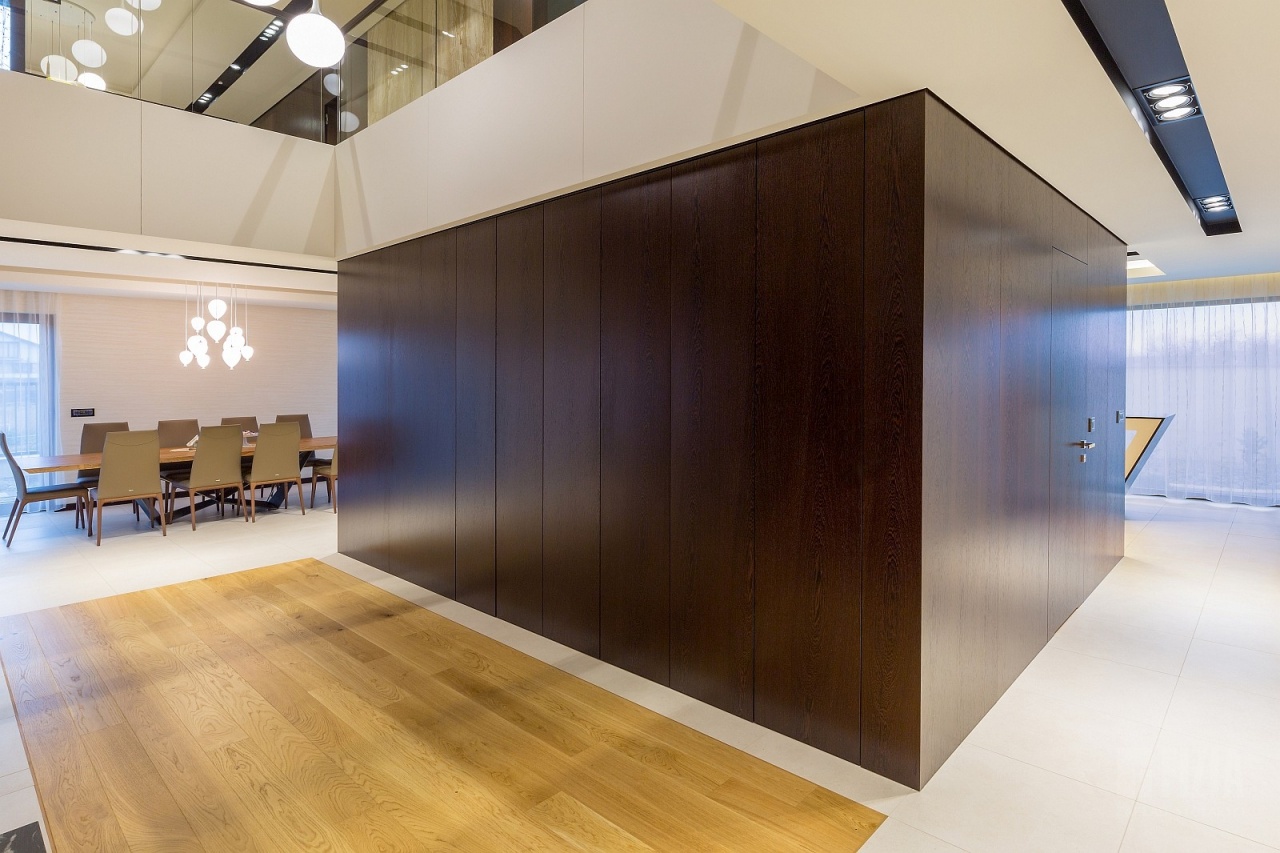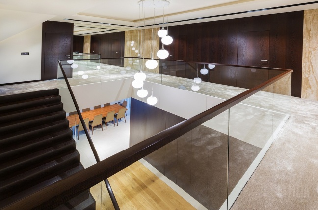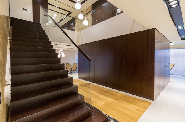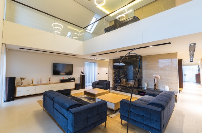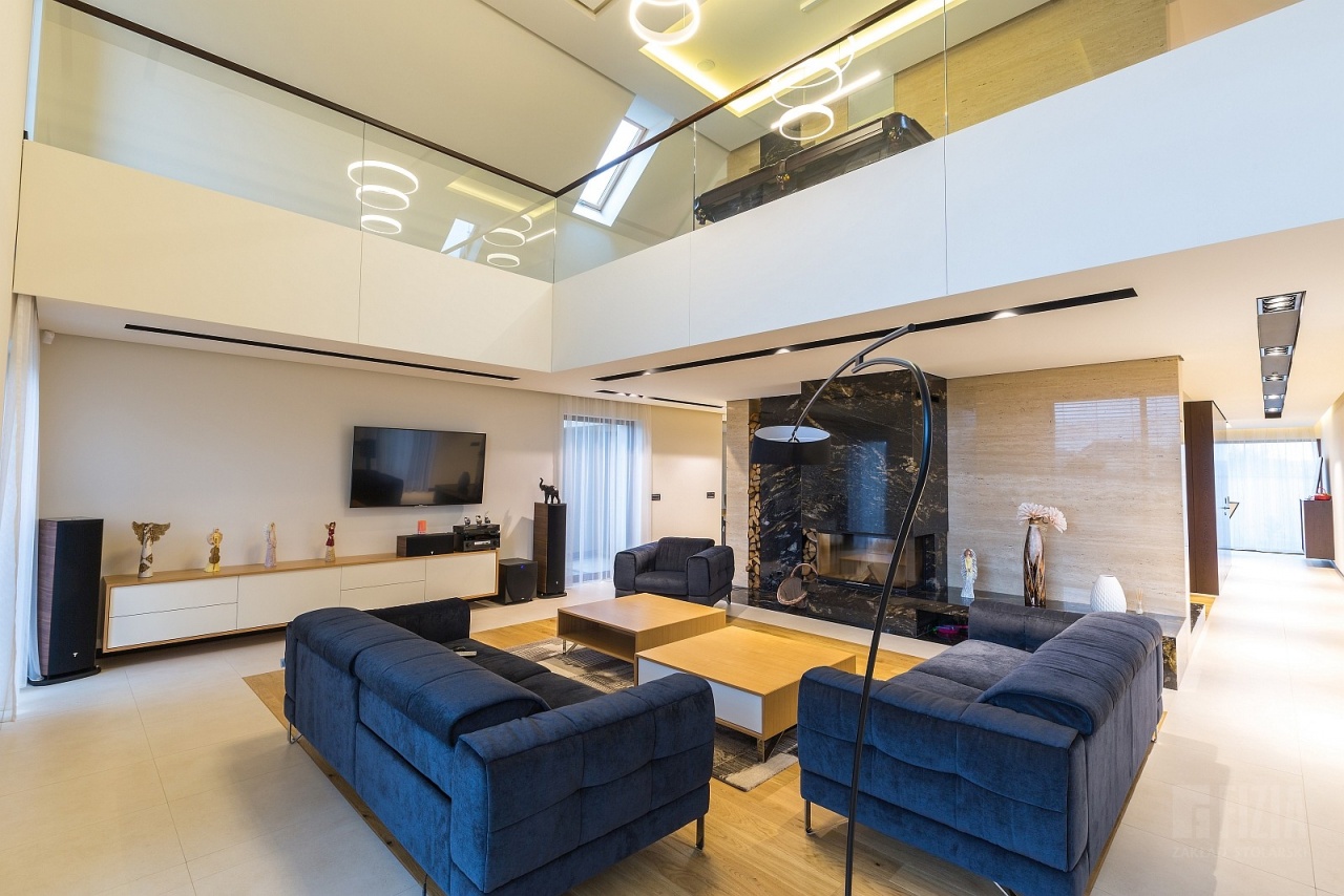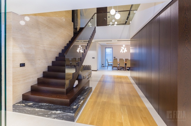 Centralnym punktem domu jest przestronna antresola, która dzięki szklanej balustradzie wydaje się lekka i otwarta. Jej wykończenie z ciemnego drewna idealnie współgra ze schodami dywanowymi o tej samej tonacji. To właśnie to drewno nadaje wnętrzu charakteru – eleganckiego, ale nieprzytłaczającego, wprowadzając nutę naturalnego ciepła do minimalistycznej architektury.